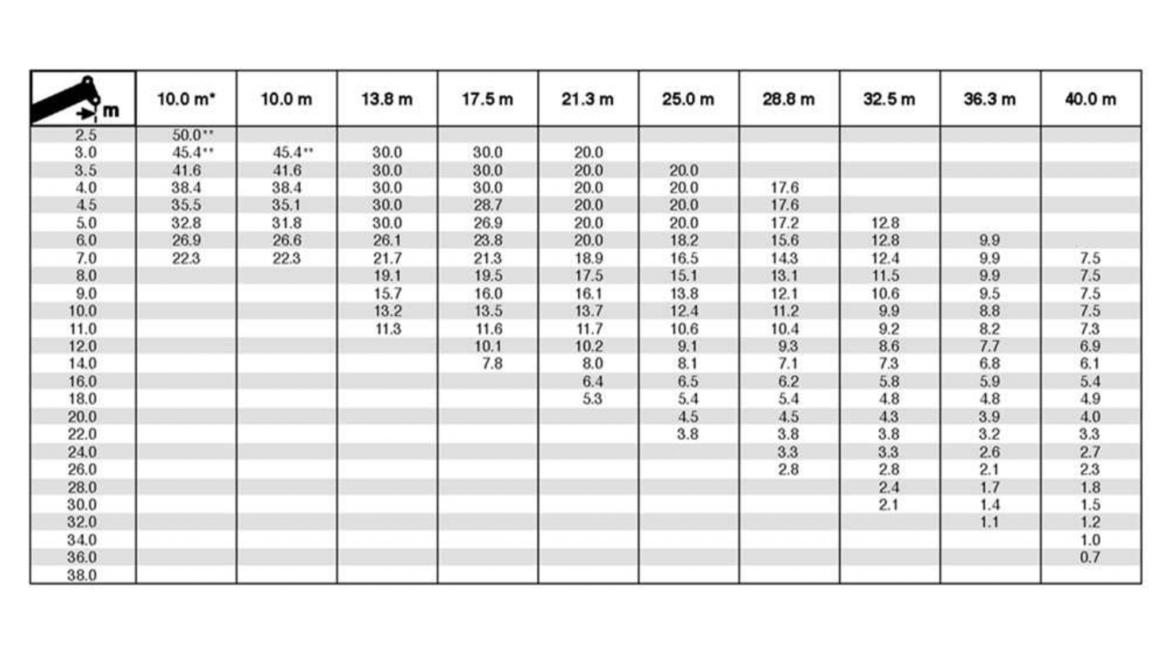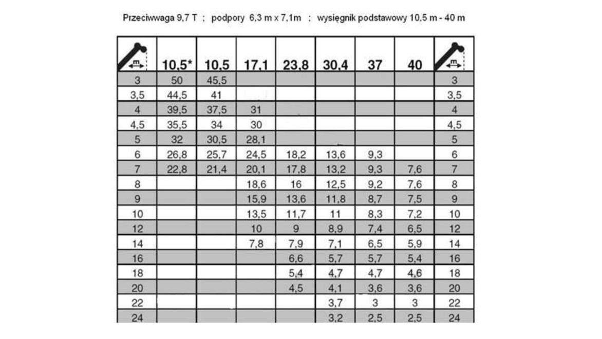 Maksymalna masa podnoszonego ładunku przy kącie β wynoszącym 40° nie może przekraczać: